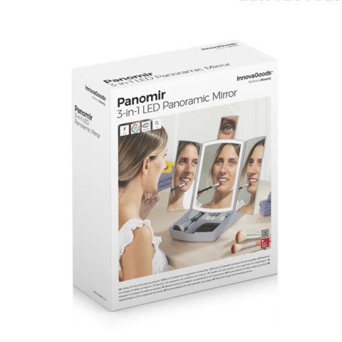 Este espejo de sobremesa panorámico y portátil cuenta con un espejo central y dos hojas laterales que se pliegan y despliegan con facilidad. También incluye un mini espejo deslizante en la parte trasera con aumento x7 para una visión aumentada de la zona facial deseada.